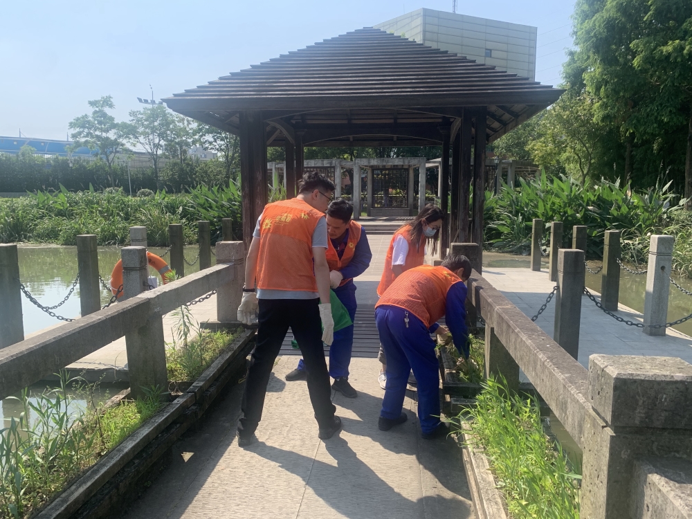 大家自带工具来到余姚市全民健身中心捡垃圾、除草、清扫庭院,协助社区为美化公共环境作贡献。