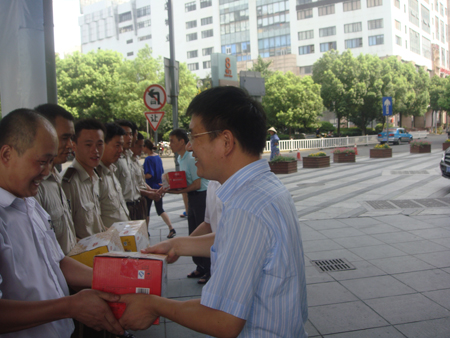 best365英国体育在线公司总经理周宏伟、工会主席陈跃进、副总经理周杰一行到天一广场,看望坚守一线的保安人员,并送上慰问品。之后,又赶赴慈城古县城县衙景区,看望服务岗位的景区职工,送上防暑用品。