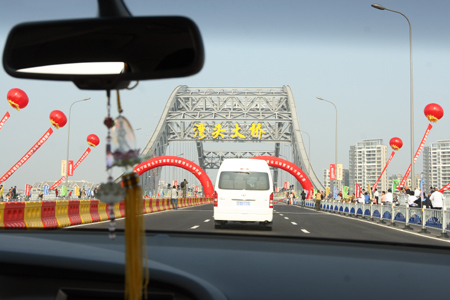 最后,在隆隆的礼炮声中,大队车辆缓缓驶过湾头大桥,象征着湾头大桥顺利开通。