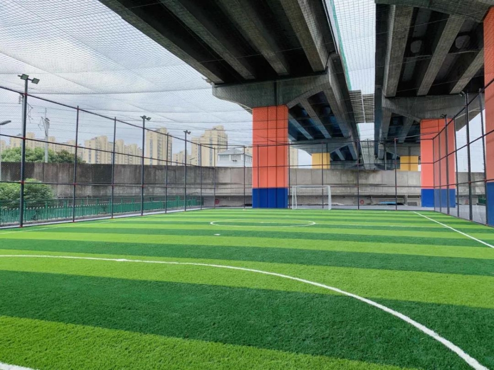 福庆体育公园设置了篮球场、足球场、网球场、羽毛球场、多功能广场、停车场等区域,结合使用人群特点,在桥梁立柱上装饰有色彩鲜明的时尚涂鸦;足球场为标准五人制笼式足球场,多功能广场全天24小时免费对市民开放,为周边居民进行晨练、广场舞等活动提供场所,最大限度实现资源共享。