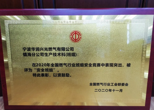 近日,宁波华润兴光燃气有限公司镇海分公司生产技术科在2020年全国燃气行业班组安全竞赛中表现突出,被评为“安全班组”。