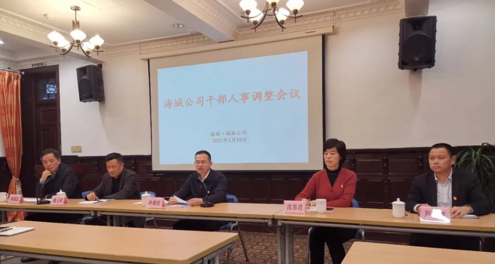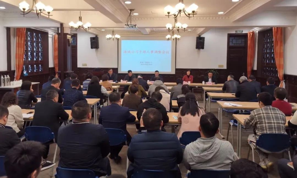 3月16日下午,海城·城旅公司召开干部人事调整宣布会,宁波best365英国体育在线党委书记、董事长钟建波,党委委员、副总经理沈菲君,组织人事部总经理姚玉明,海城公司全体员工参加。