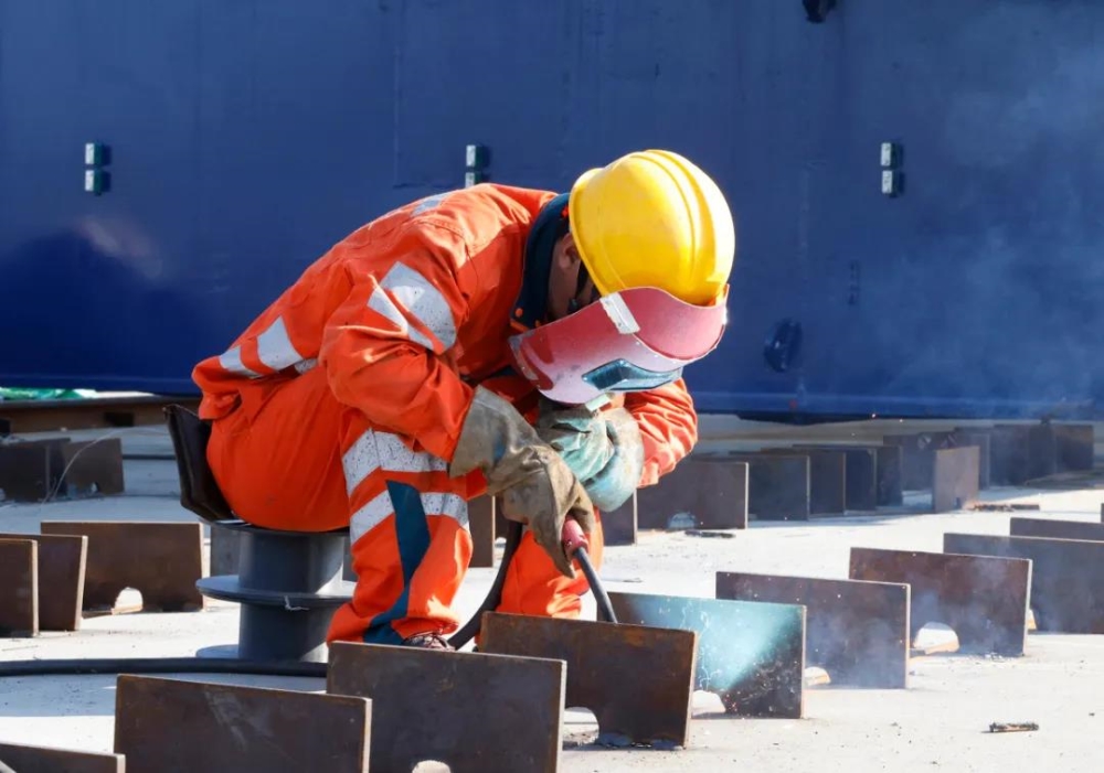 只见约200吨重的桥面吊机正在发力,稳稳地将重达30吨的钢桁梁杆件放置到支墩上,再由焊接工操作,把一个个钢桁梁杆件组装成节段。