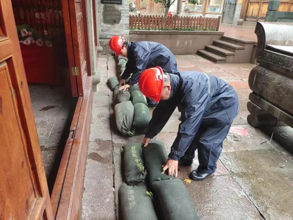 拆迁地块,确保区域内无外来人员滞留;在建工程,检查临时围挡加固和已经种植完成树木加固情况,再次确认民工宿舍临时用房、施工现场安全及民工宿舍人员是否全部转移;南塘老街,现场检查河埠头安全防护情况,随时观测河埠头水位,做好停车场车辆清空工作,所有装修店铺暂停施工;金汇小镇,做好低洼地带沙包的应急准备,排水泵的放置到位情况,落实停车场各车库所有停放车辆清场工作;万豪酒店,清空各平台杂物,梳理排水沟渠及下水口,测试所有集水井的污水泵工作情况;检查固定外网绿植和广告牌。