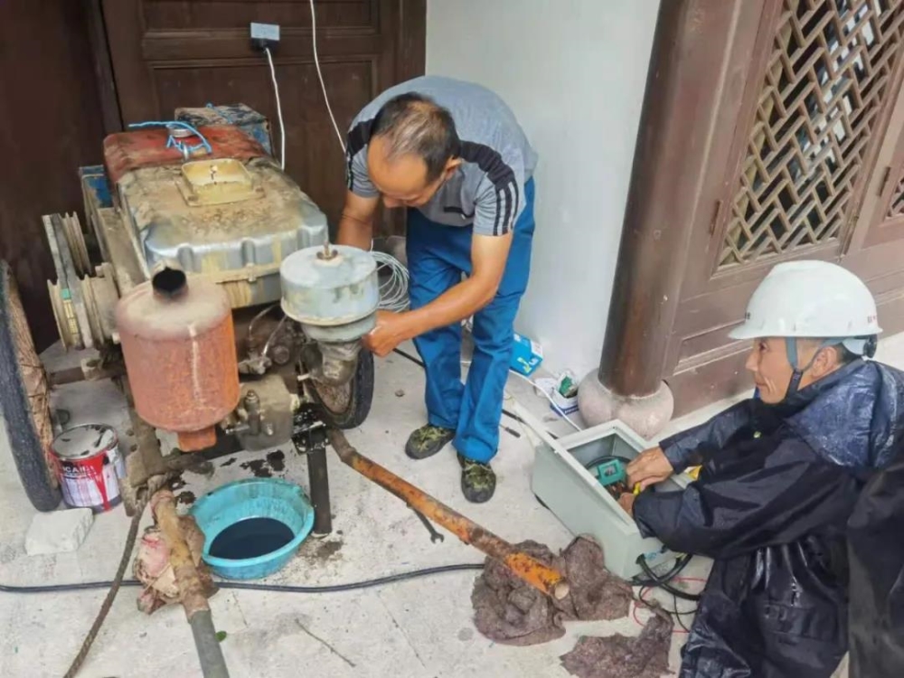 半边山一线防台人员调试临时发电机、帮助商户搬运物资