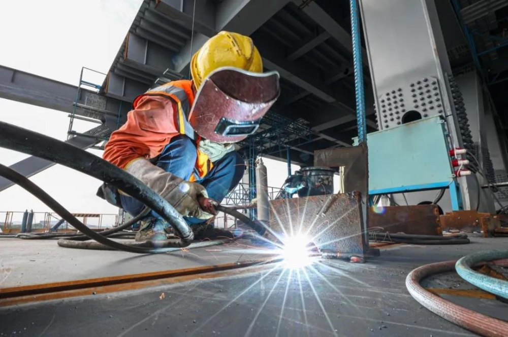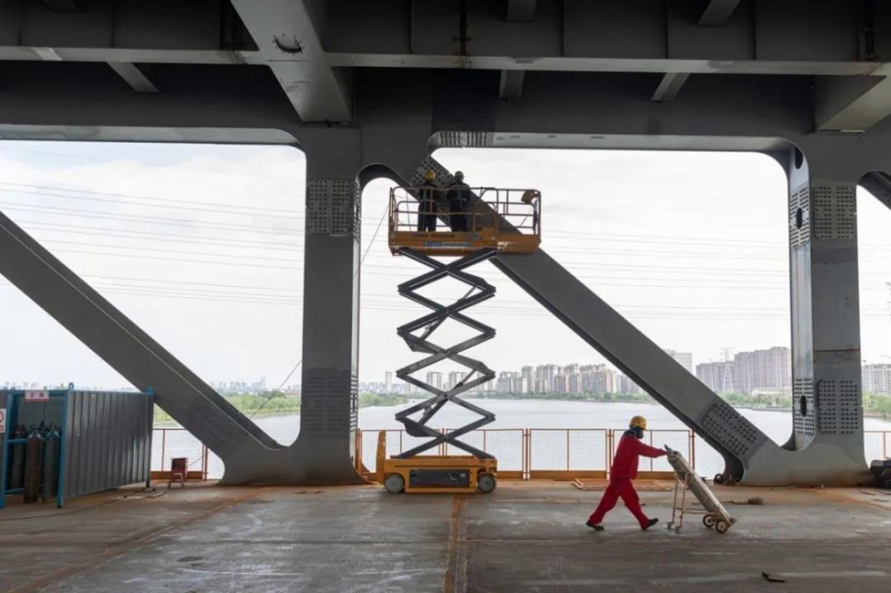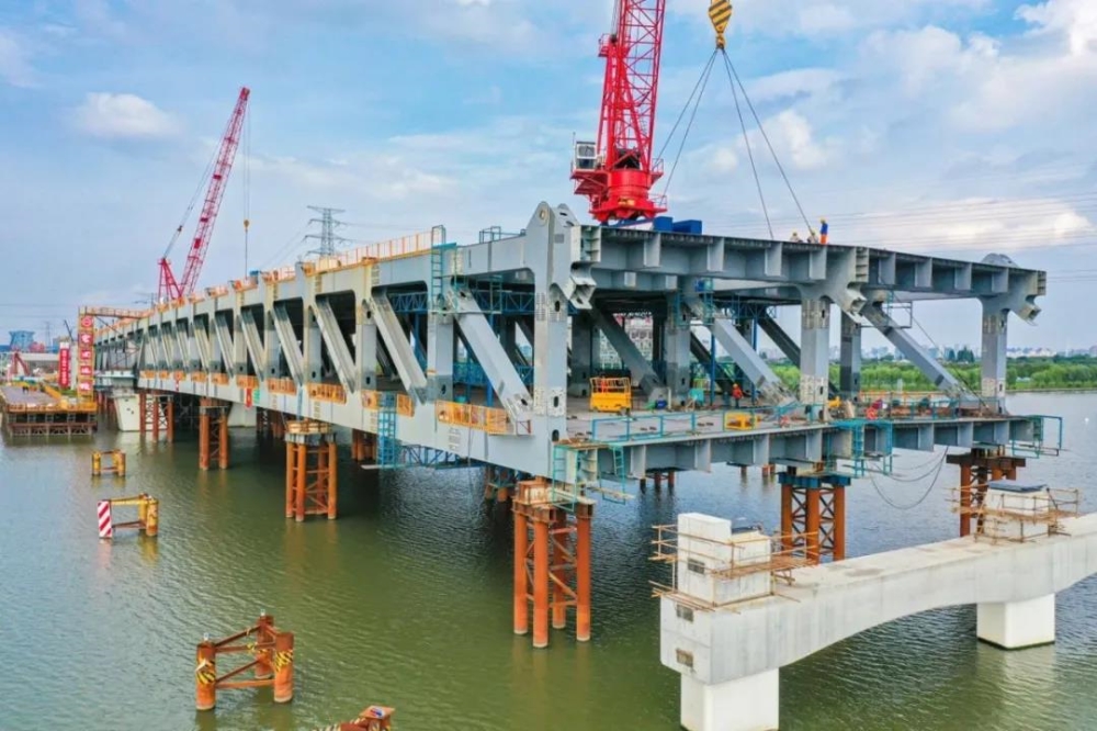 晴空烈日之下,西洪大桥建设工地依旧是一片繁忙景象,在横跨江面的主桥施工现场,焊接、油漆、吊装等多项工序正按节奏有序推进。大桥采用的“桥梁构件预制拼装”工艺,有效提升了桥梁施工效率,为2022年年底大桥全面建成通车提供了有效保障。