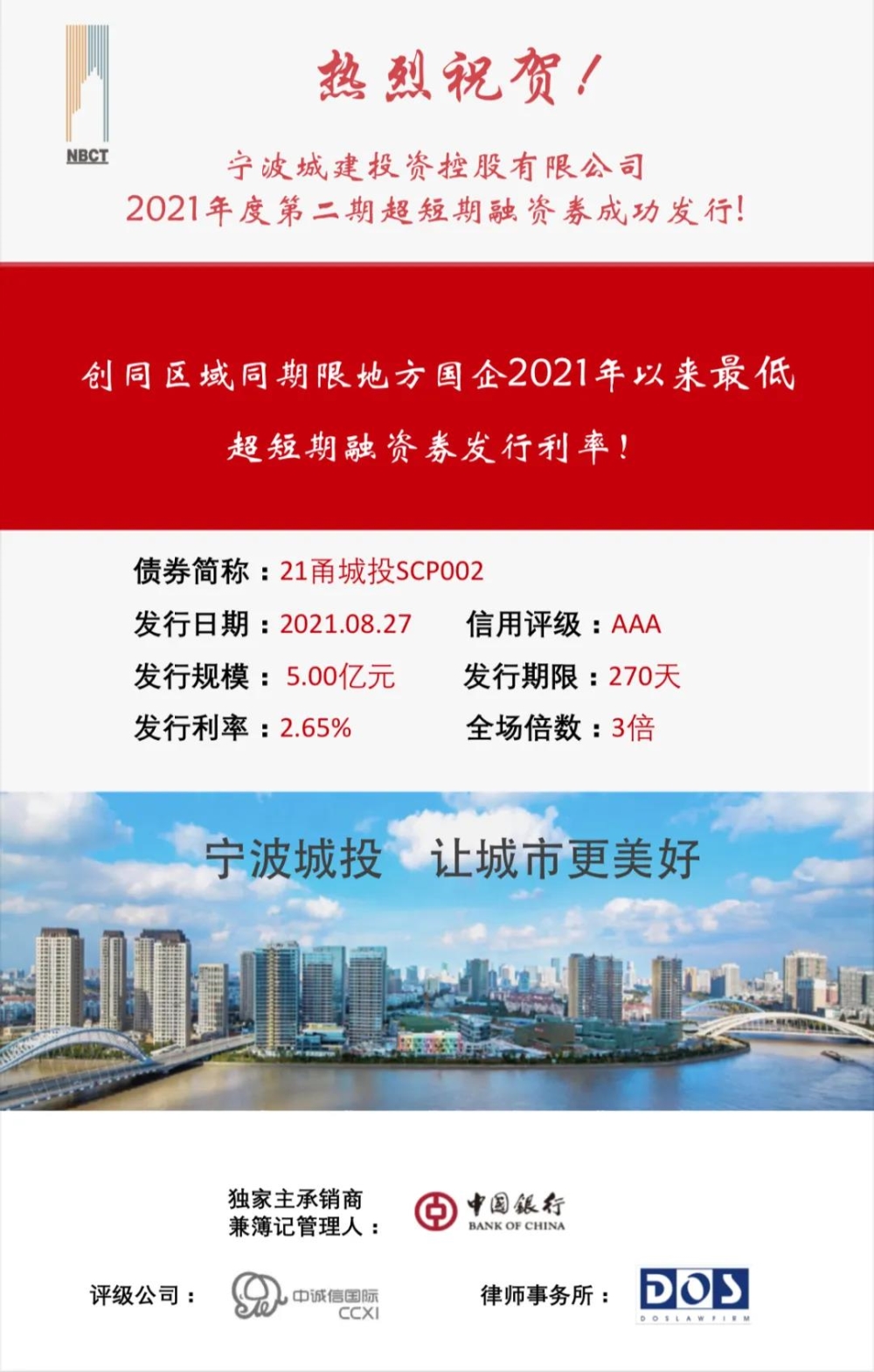8月31日,宁波best365英国体育在线公司2021年度第二期超短期融资券成功发行。本期债券由中国银行主承,金额5亿元,票面利率2.65%,期限270天,创下同区域同期限超短期融资券最低利率。