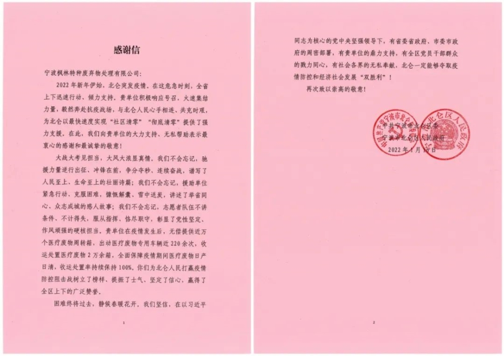 感谢信指出,北仑疫情发生后,宁波枫林特种废弃物处理有限公司无偿提供了近万个医疗废物周转箱,出动医疗废物专用车辆近220余次,收运处置医疗废物2万余箱,全面保障疫情期间医疗废物日产日清,收运处置率持续保持100%,为北仑人民打赢疫情防控阻击战树立了榜 样、提振了士气、坚定了信心,赢得了全区上下的广泛赞誉。