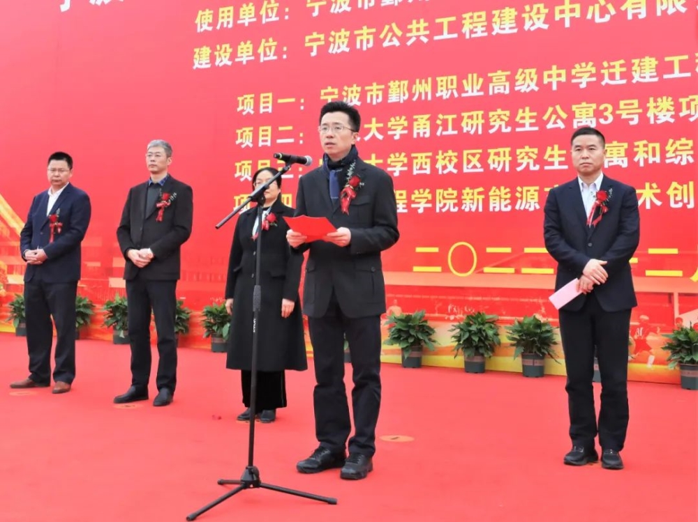 12月8日上午,2022年度宁波市教育系统投资项目集中启动仪式在鄞州职业高级中学迁建工程项目部现场举行。副市长朱欢致辞并宣布开工。市教育局党委书记、局长毛才盛主持仪式。