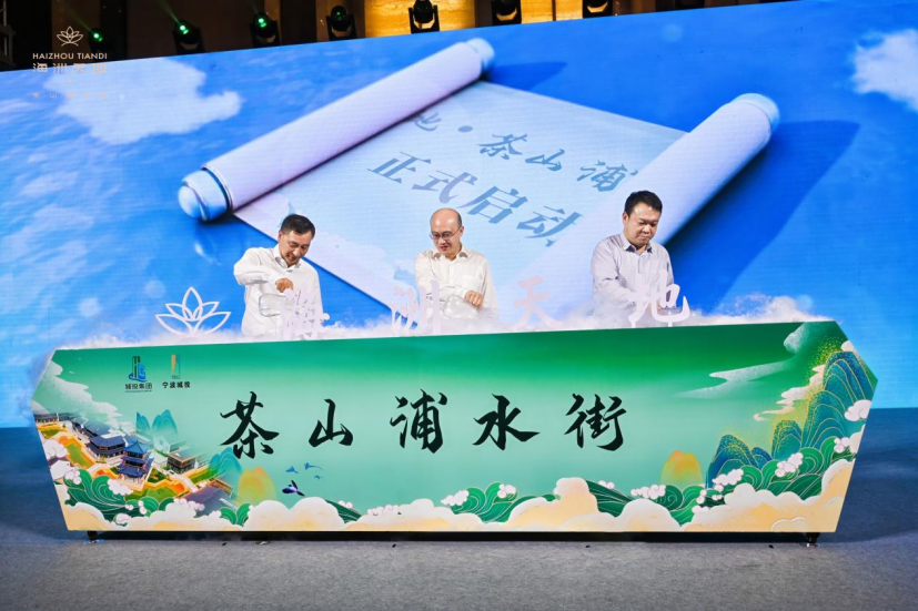现场,各方代表上台共同启动发布仪式,随着如意之水的注入,“海洲天地”四个大字缓缓升起,海洲天地·茶山浦水街项目完成了自己的第一次正式亮相。