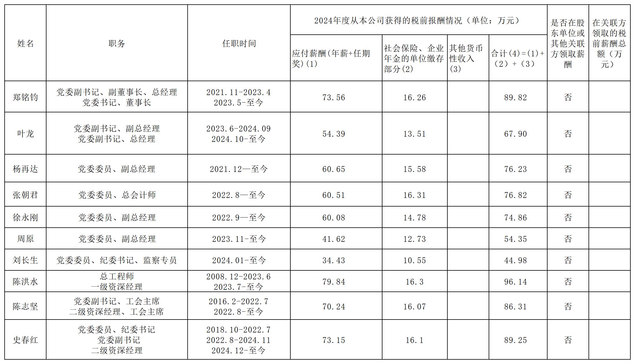 宁波城建投资集团有限公司经营班子成员2024年度薪酬情况